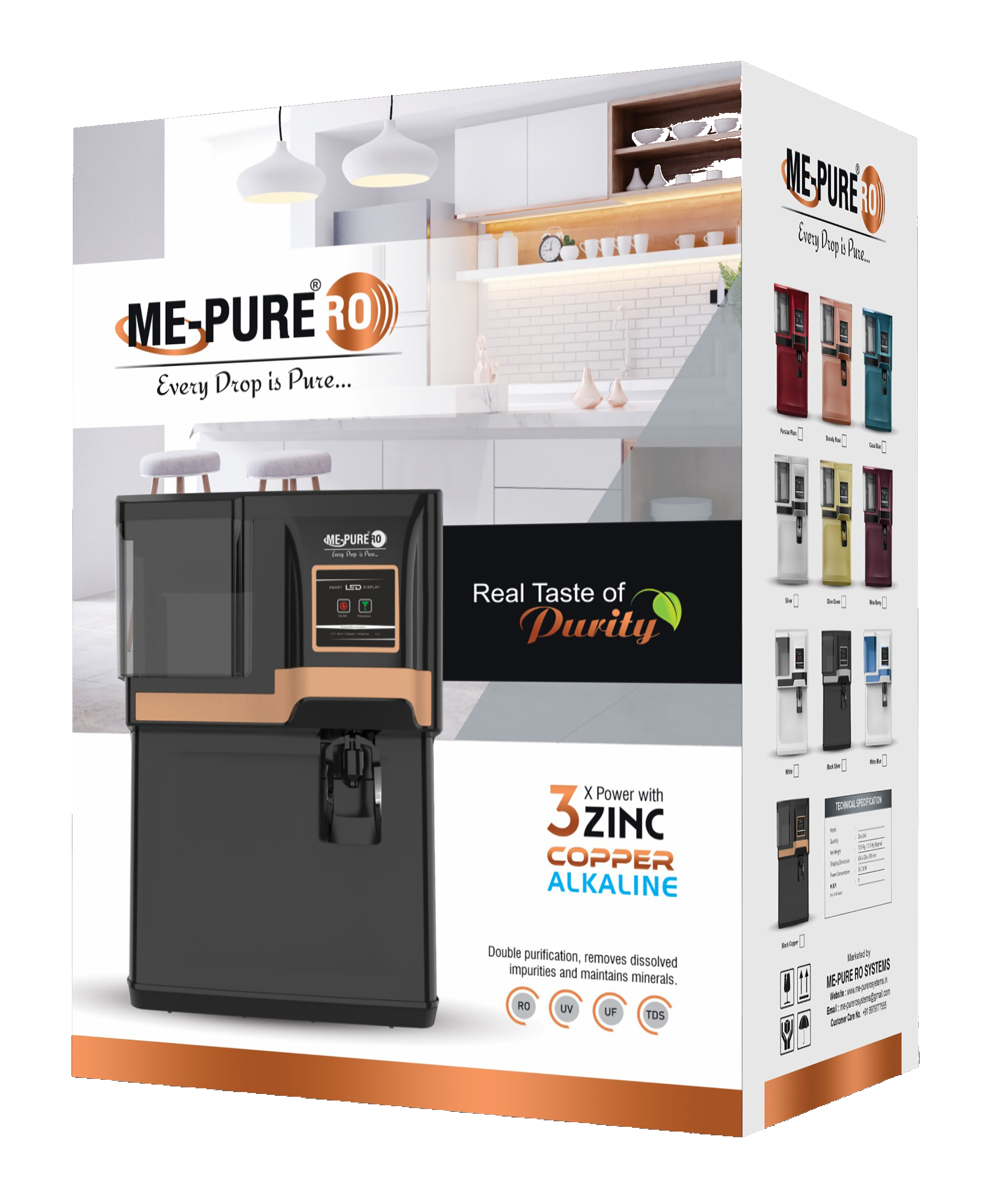 - Advanced RO+UV+UF Technology – Ensures removal of impurities, bacteria, viruses, and dissolved salts, making water 100% pure.